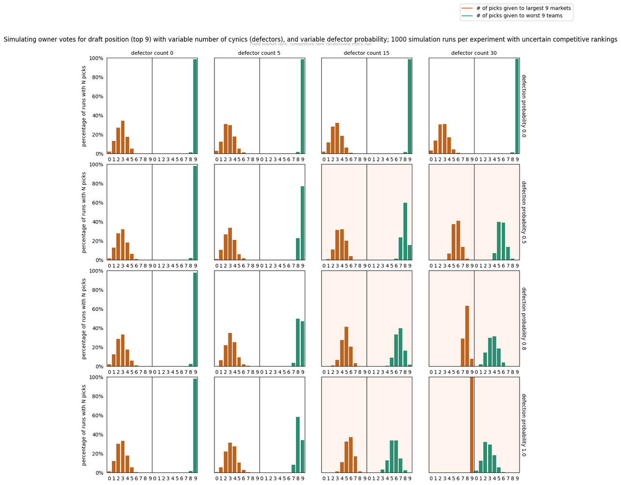 (For instance, the plot with defector count 15, and defection probability 0.5 represents half of the owners being completely earnest in creating their ballot, with the remaining 15 when making their ballot decide half the time to pick the worst team, and the other half of the time they pick the largest media market)